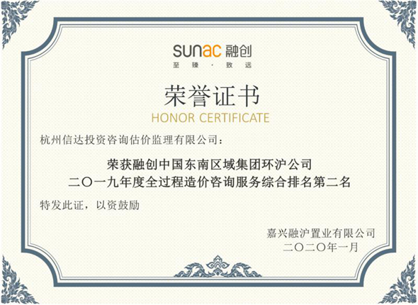 融創中國東南區域集團環滬公司2019年度全過程造價咨詢服務綜合排名第二名