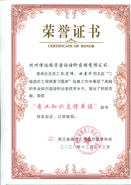 浙江省建設工程造價管理協會“專業知識支撐單位”榮譽證書