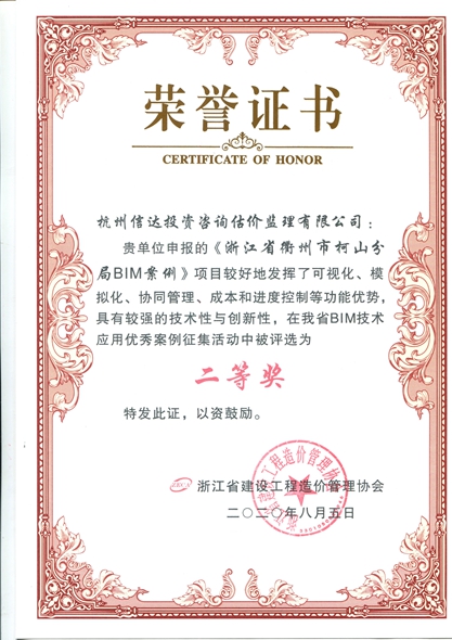 浙江省建設工程造價管理協會“BIM優秀案例二等獎”